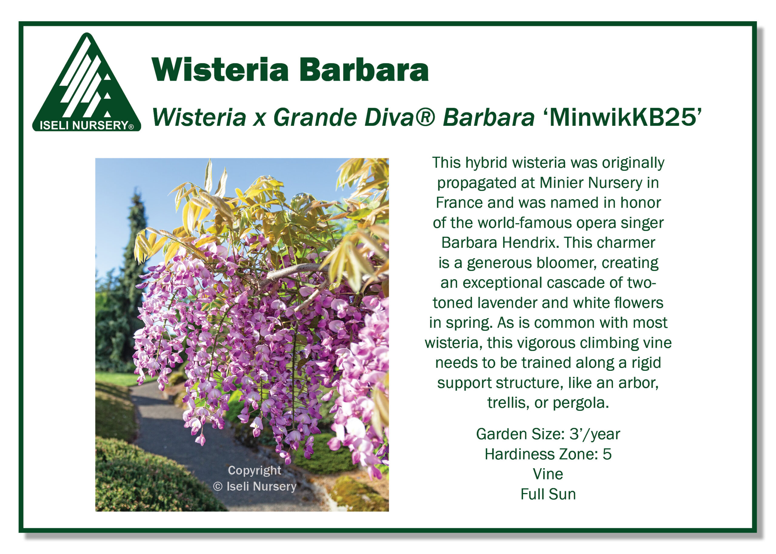 This hybrid wisteria was originally propagated at Minier Nursery in France and was named in honor of the world-famous opera singer Barbara Hendrix. This charmer is a generous bloomer, creating an exceptional cascade of two-toned lavender and white flowers in spring. As is common with most wisteria, this vigorous climbing vine needs to be trained along a rigid support structure, like an arbor, trellis, or pergola.